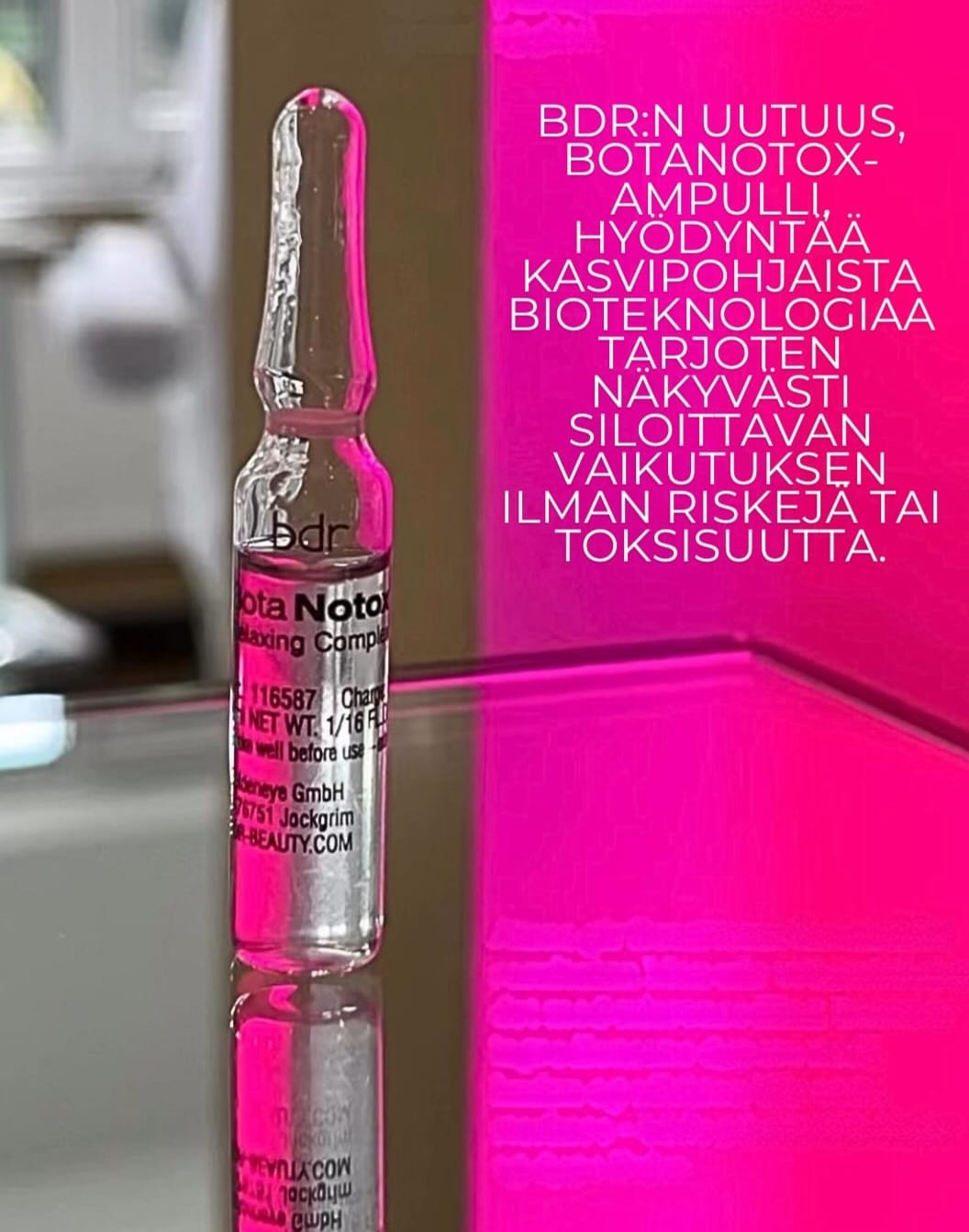 Tehokas, mutta hellävarainen vaihtoehto ilmejuonteiden pehmentämiseen. BotaNoTox- ampulli hyödyntää kasvipohjaista bioteknologiaa tarjoten näkyvästi silottavan vaikutuksen ilman riskejä tai toksisuutta.